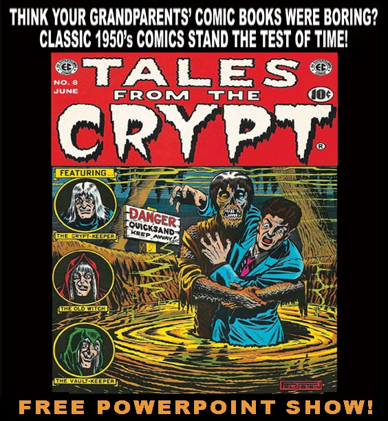 "THE MAESTRO'S HAND!" Furious that his fiancee Virginia has left him for classical music Maestro Borrstein, a surgeon named Dr. Hellman decides to take revenge by cutting off the Maestro's hand. The "operation" was performed for "medical necessity" after the Maestro cut his hand and Virginia brought him to Dr. Hellman. Now, no longer able to play the piano, the Maestro ends his life. But the Maestro's severed hand takes on a life of its own, coming back to haunt Dr. Hellman. See the slideshow here: Click here to see more of our Comic Book Read-A-Long Slideshows: | |||||||