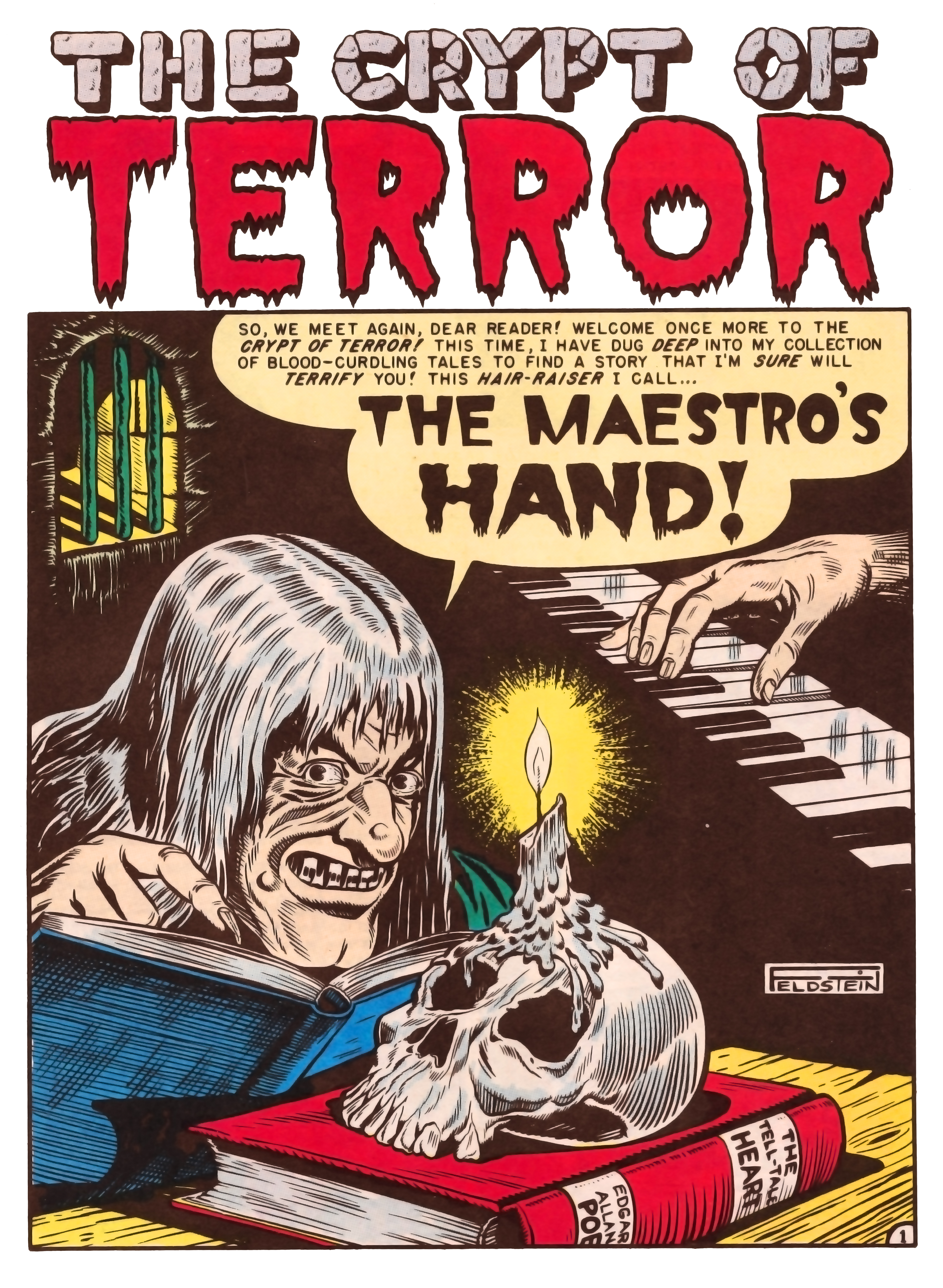 "THE MAESTRO'S HAND!" Furious that his fiancee Virginia has left him for classical music Maestro Borrstein, a surgeon named Dr. Hellman decides to take revenge by cutting off the Maestro's hand. The "operation" was performed for "medical necessity" after the Maestro cut his hand and Virginia brought him to Dr. Hellman. Now, no longer able to play the piano, the Maestro ends his life. But the Maestro's severed hand takes on a life of its own, coming back to haunt Dr. Hellman. See the slideshow here: Click here to see more of our Comic Book Read-A-Long Slideshows: | |||||||